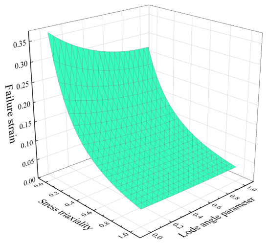 According to the stress triaxiality and the equivalent plastic strain at fracture in Table 3, unknown parameters in the MMC equation were fitted by a Python script. The MMC fracture surface obtained after fitting is shown in Figure 7.