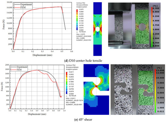 Figure 8 shows the comparison of force–displacement curves and failure modes between the simulation calculation and experiment results for five specimens. As shown in Figure 8a, according to the force–displacement curve, there was no softening stage before material fracture, and similarly no significant necking was observed before material fracture during the simulation and experiment. In Figure 8b,c, the minimum cross-sectional positions of the R5 and R20 notched specimens are in the middle of the specimen. The stress concentration phenomenon caused the specimen to fracture first at the edge of the notch. The fracture displacement was about 0.55 mm and 0.75 mm. During the tensile deformation process, the specimen first experienced elastic–plastic deformation and fracture occurred instantaneously at the maximum strength. Similarly to the static tensile experiment, after the tensile force reached the maximum value, the material almost did not soften and no significant necking occured; instead, fracture occured directly. Figure 8d shows the force–displacement curve of the D10 center hole specimen. The fracture was first generated at the internal hole wall of the middle section, and then extended along the hole wall normal to the axial load until the complete fracture. Figure 8e shows a sheared 45° specimen with fracture starting at the arc edge of the least cross section. With the tensile deformation, the crack at the edge propagated into the matrix and eventually led to a complete fracture. Compared with the notched specimen, the tensile displacement of the shear specimen was larger, about 0.92 mm. A significant stress concentration was observed before the fracture under all test conditions. The comparison of the FEM results with the experimental results is given in Table 4, wherein the maximum error was successfully controlled within 5%.