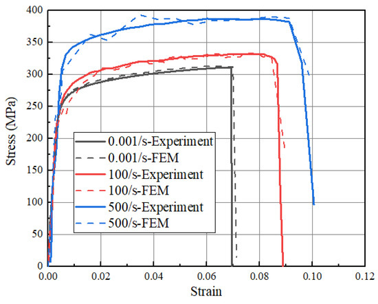 After introducing the strain rate correction factor, the FEM results under different strain rates are shown in Figure 10. The established FEM model can simulate the experimental results well, and the errors of the numerical results are all below 5%.