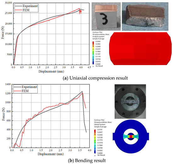 To verify the simulation reliability of fracture strains obtained by the MMC equation, bending specimens with the theoretical stress triaxiality of 0.66 and compression specimens with the theoretical stress triaxiality of −0.33 were thereafter our focus. The FEM model with the same conditions as the experiment was also established in the simulation environment. The fracture strains were obtained by the MMC equation and input to the material model for simulation. A comparison of the simulation results with the experimental results is shown in Figure 11. The force–displacement data of the numerical simulation are in good agreement with the experiment results, indicating that the MMC failure model is capable of simulating the failure behavior of die-cast aluminum alloy A356.