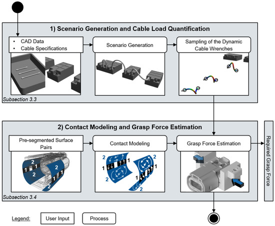 In order to achieve these objectives, a physics simulation scenario is automatically generated in step 1. Thus, the cables are connected to the plugs and manipulated along predefined trajectories to be installed in a product. Thereby, the dynamic cable wrenches induced on the plugs are sampled. In step 2, the contact relations between the gripper jaws and the surface pairs of the plugs are modeled. This finally allows the dynamic cable wrenches determined in step 1 to be evaluated and the required grasp force to be estimated. Hence, a user can investigate the impact of the dynamic cable behavior on the grasping process. Thereupon, the robot trajectories can be adapted in case of unfavorable deformations and, thus, avoid peaks in the required grasp forces. Moreover, a user can make an informed decision for a surface pair and avoid overdimensioning.