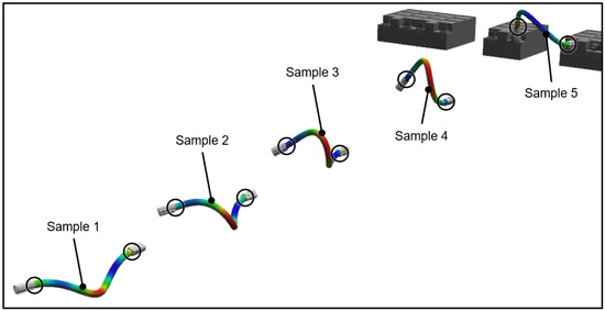 Each cable is simultaneously grasped at both plugs, manipulated along the automatically initialized trajectories, and mated to the associated sockets. This results in different deformations over time, as shown in Figure 8b–d. Since the weight force of the two plugs and the cable is negligible compared to the deformation effect, the gravity is set to zero. Moreover, a uniform pressure distribution and a friction coefficient of are chosen for each contact. For each cable, its dynamic wrenches are sampled for both ends and at 15 WPs at a constant rate. WP 1 depicts a cable placed in the load carrier, and WP 15 represents the mounted state. In addition, to determine the required grasp force at each of the 15 WPs, two further estimations are performed. On the one hand, the required grasp force, if only the force to mate the plug to the socket, is taken into account. This mating force is simplified as a pure axial force in the negative z-direction of 75 N in the EC coordinate system and is known from the product specifications of the EC; compare Figure 5. On the other hand, the required grasp force for superimposing this mating force with the last cable wrenches at WP 15 is considered.