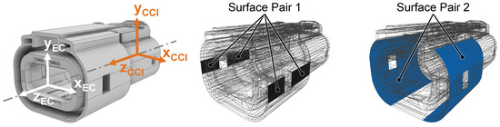 Example of a high-voltage plug (https://www.te.com/deu-de/product-4-2103015-1.html, accessed on 9 February 2023). Its CAD data (left) is used to derive different surface pairs, as shown in the middle (surface pair 1) and on the right (surface pair 2). On the left, the convention of this work for the coordinate system of the plug of the EC (white, EC) and the cable-connector-interface (orange, CCI) are shown.