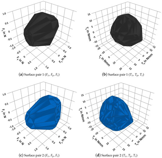 Exemplary representation of the convex hull of the GWSs of surface pair 1 (black) and surface pair 2 (blue) of the EC shown in Figure 5 with respect to the coordinate system EC, a grasp force of 1 N, and a friction coefficient of . For visualization purposes, (a,c) show the force components , , and of the six-dimensional GWS projected into the three-dimensional space. Analogously, (b,d) show the projection of the three torque components , , and .