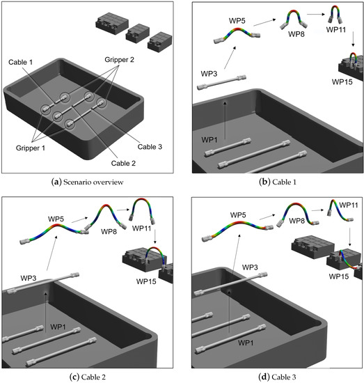 Application scenario of interconnecting battery modules via high-voltage ECs. (a) gives an overview of the automatically generated scenario, in which three high-voltage cables are provided in a load carrier in order to interconnect four battery modules. (b–d) show the discrete time steps 1 (supply), 3, 5, 8, 11, and 15 (mounted state) of the trajectories along which the three cables are manipulated and consequently deformed. Cable 1 (b) and cable 2 (c) are mounted with a bend of 180 degrees around the same axis, and cable 3 (d) with two bends of 90 degrees each around two different axes. For each cable and each WP, the local curvature is color-coded individually (red: high, blue: low). At WPs 1 and 3, the cables are not color-coded, because their local curvature is close to zero here. The deformation begins after WP 4.