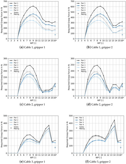 For WPs 1–4, the required grasp force is zero since the cable is removed from the load carrier and manipulated solely vertically, and, therefore, does not undergo any deformation. From WP 5, the courses are strongly individual, especially when comparing the three cables. The correlation between the cable deformation and the required grasp force can be observed qualitatively using cable 2 as an example. Its deformation increases from WP 5 to WP 8 and then decreases again through WP 11; compare Figure 8c. This is reflected in the corresponding values for the required grasp force in Figure 9c,d. Moreover, qualitatively similar courses with different scaling of the four surface pairs are shown for one cable and one gripper. If we compare a planar surface with a non-planar one along the same axial plug position, the planar surface requires a higher grasp force for almost every WP. Moreover, the closer a surface pair lies with respect to the CCI, the lower its required grasp force is. This can be seen when comparing surface pairs 1 with 3 and 2 with 4. With a few exceptions, surface pairs 3 and 4 require less grasp force. This can be explained by the lower leverage of the CCI to surface pairs 3 and 4 compared to 1 and 2.