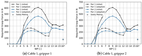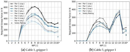 By comparing the initial trajectories with the adapted ones, it can be observed that the required grasp force is significantly reduced for WPs 5–12. For gripper 1, WPs 13–15 still offer a slight potential for improvement compared to WP 16* and, thus, avoidance of overdimensioning. For cables 2 and 3, the required grasp force can also be significantly reduced by manually adapting the trajectories; see Figure A1 in Appendix A.