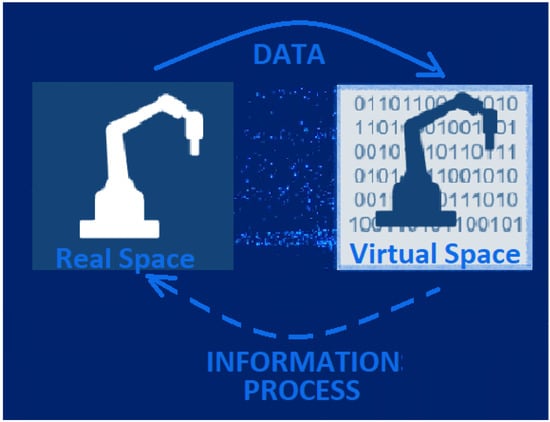 To define the term I4.0 only through one word, this is digitalisation. The concept of “digitalisation” alludes to our society’s greater reliance on automation, networked, and web-enabled technology [3]. The main technology pushing digital transformation across all industries, and not only, is called digital twin (DT), representing a concept associated with cyber–physical integration. The DT concept came to life in 2002 at the University of Michigan when Prof. Grieves introduced, during a PLM course, the concept of virtual space that was equivalent to a physical product and with a bidirectional communication channel between these two spaces [4]. Presently, there are several different definitions of a digital twin [5,6,7,8,9,10]. Nonetheless, the essence of all of them stays with the initial concept of a mirrored spaces model with bridges of communication between the physical world and the virtual world, and the conceptual model is presented in Figure 1.