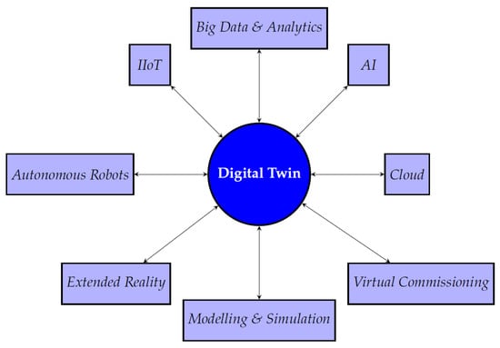 Digital twin is a key technology for improved industrial performance, as it integrates or merges with many other technologies from the Industry 4.0 paradigm. These include IIoT, big data and analytics, artificial intelligence, cloud computing, virtual commissioning, modelling and simulation, extended reality, and autonomous robots, as depicted in Figure 2. The particular technology employed in digital twin technology varies based on the nature of the application and its specifications.