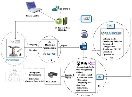 The development workflow of the case study DT application for a 3DoF cylindrical robot type (or RPP robot, which contains three linkages and three joints—one revolute joint that rotates about the base, and two prismatic joints), as presented in Figure 3, is based on three main elements: (1) 3D asset creation; (2) DT and VC application development—the ecosystem around AS; and (3) DT and MR application development—the ecosystem around Unity. The interactions between architectural components, physical and cyber layers, are a part of the DT approach and are realised through the OPC approach, which is usually used in horizontal and vertical communication automation processes because it provides semantic interoperability for all layers.