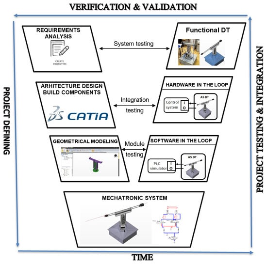 One of the challenges in using modelling and simulation software, particularly when employing high-level modelling approaches with predefined elements from internal libraries, is the limitation imposed on customisation and flexibility. It is the case with industry applications for building DT models. This becomes evident when a low-level modelling approach is required, which involves building new components or mechatronic systems using CAD data and focusing on assembly and functional interactions between various elements. This is the case for the project from this paper developed in AS (a physics-based modelling and simulation tool with workshops such as pneumatic, hydraulic, electrical, and control), where the analytical and dynamic behaviour of the entire model can provide significant added value for a pneumatic mechatronic system. The process follows a V-diagram, as shown in Figure 5, starting from requirements powerfully linked with the tasks of the pneumatic robot from physical space up to the validation and optimisation of DT through the VC approach.