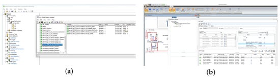 Configuration of the OPC mechanism: (a) the screenshot from the KEPServerEX—defining the OPC server; and (b) the screenshot from the AS—the OPC client linked with the variable from DT.
