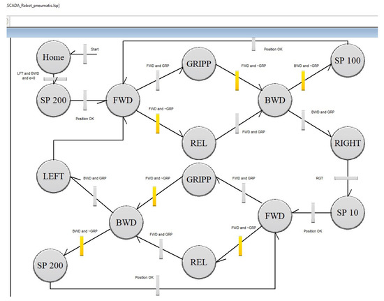 The robot returns to its homing point when the user presses the “Start” button. In the home pose configuration, the robot has the gripper closed, rotated to the left, completely backward, and has the cylinder responsible for lifting the robot chassis positioned at 10 mm. In the following state of the graph, the robot transitions from its home pose to a new state in which the cylinder responsible for lifting the robot chassis (U/D cylinder) raises it to its maximum height of 200 mm. This movement represents a change in the robot’s position and a step towards executing the defined sequence. After reaching the maximum height, the next step in the sequence involves the bilateral F/B cylinder moving forwards. This action represents a further change in the robot’s position and continues the execution of the defined sequence.