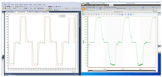 In Figure 12, the behaviour of the U/D cylinder is represented for both the actual robot (derived from monitoring the PLC programming software for the values received from the ultrasonic distance sensor) and its DT (taken from the position graph specific to the cylinder in AS) for various reference values imposed in the working scenario. This comparison directly assesses the DT’s accuracy in replicating the robot’s behaviour. It helps identify potential areas for improvement and calibration to ensure a more faithful representation of the natural system.