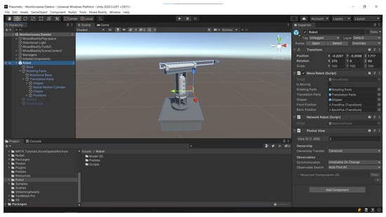 This paper’s organisation is as follows: Section 2 covers DT and VC applications in robotics, software tools for DT implementation, and the role of XR technologies, particularly MR, in data accessibility and analysis. Section 3 overviews the development workflow for a 3DoF pneumatic cylindrical robot’s DT application. Section 4 presents the implementation and validation of a digital twin in AS environment. Section 5 presents the implementation of the same robot in Unity and facilities a holographic approach. Section 6 presents the comparative advantages of both implementations. Section 7 comes with a few conclusions and directions for future research.