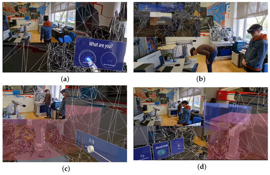 Snapshots at various moments during the execution of the working scenario. (a) t = 12 s; (b) t = 23 s; (c) t = 32 s; and (d) t = 57 s.