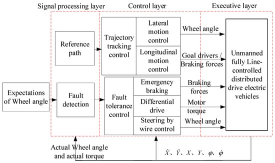 The whole vehicle is controlled in layers, with a signal processing layer, control layer and executive layer. Signal processing layer: according to the collected information on the exact status of the vehicle at a certain time by sensors and the planned reference route for the variances between the two sources of information, send the results to the control layer. The fault diagnosis module also detects the status of the steering-by-wire sensors and actuators and sends the results to the control layer.