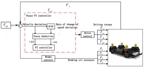 The drive control strategy of the unmanned fully line-controlled distributed drive electric vehicle is to indirectly control the vehicle speed by means of controlling the drive motors’ drive torque and thus the current speed tracks the expected speed. When the speed of the vehicle is faster, the computational efficiency of the controller has greater requirements; thus, for the purpose of minimizing the calculation workload and optimizing the live control policy, the fuzzy PI algorithms are applied. The velocity bias and the change rate of the speed bias are used as inputs to the fuzzy PI controller, which solves the drive torque required for an unmanned fully wire-controlled distributed-drive electric vehicle according to fuzzy rules. The drive torque is applied to the four drive motors and distributed to the four wheels for acceleration control.