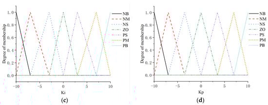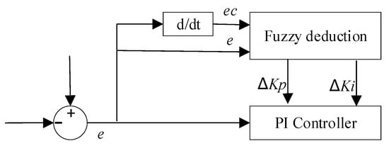 As in Figure 3, the controller’s inputs are e (error of system) and ec (the rate of error change in the system). Fuzzy rules are formulated for reasoning decisions, and the two parameters of the PI controller are adjusted in live time with parameter changes of and . The output is obtained by adding the changes to the initial values of the parameter values.
