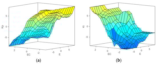 Fuzzy rule plane diagram of Kp, Ki. (a) Fuzzy rule plane diagram of Kp; (b) Fuzzy rule plane diagram of Ki.