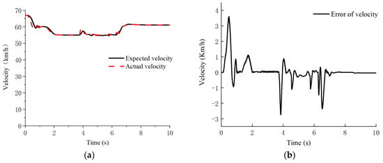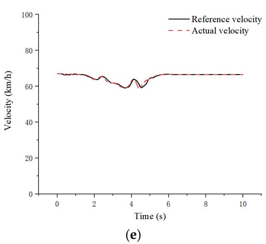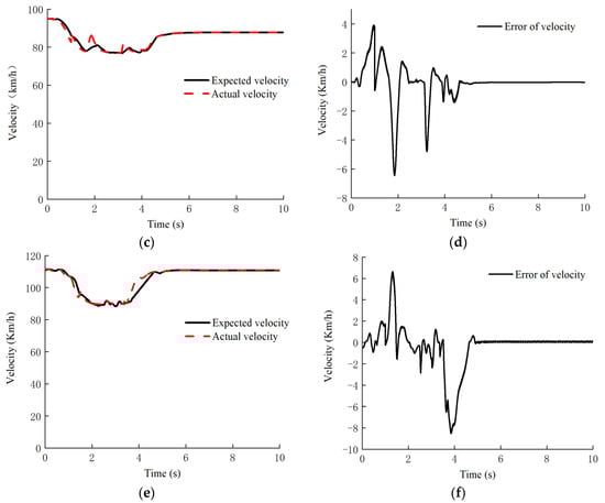 From Figure 7a,b, the actual velocity keeps track of the desired speed well, maximum speed error is within 4 km/h and its maximum error generation position is also in the just start, which indicates that the longitudinal motion controller keeps track of the desired speed well on roads with low traction. Figure 7c,d reveal that genuine velocity tracks the expected velocity, and the velocity error grows with velocity. At 2 s, there is a swing in the vehicle velocity, at which time there is a large velocity error due to the fast velocity and the relatively small ultimate adhesion between the tires and the ground, and the maximum velocity error is within 7 km/h, indicating that the longitudinal motion controller can track the desired velocity well on the medium adhesion road. As described in Figure 7e,f, the actual velocity keeps track of the expected velocity. At 4 s, due to the fast velocity, the actual velocity exceeds the desired velocity at this time and needs to be decelerated. Considering that the high-speed emergency braking will cause vehicle stability, there is a large error in velocity tracking, but it exists for a short time and does not have a great impact on the overall effect. Therefore, on the high adhesion road, it shows that the longitudinal motion controller can track the desired velocity very well.