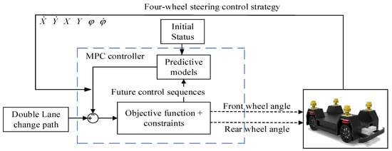 As displayed in Figure 8, the fore and aft tires turning angles of the wheels are solved according to MPC theory for prediction and optimization on the basis of an accurate model. The wheel angles calculated by the two controllers are fed to the vehicle’s linear actuators to assure the vehicle follows the required trail precisely and stably. A joint simulation model is set up in the MATLAB/Simulink and CarSim 2019 software. Typical operating conditions are set up, and the simulation is validated on a high velocity and high adhesion coefficient and medium velocity and low adhesion coefficient road surface.