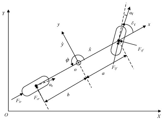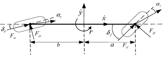 In Equation (6), is the increase in speed of the vehicle in the orientation of x; is the increase in speed of the vehicle in the orientation of y; and are the velocity of the vehicle in the orientation of the X and Y axes of the geodetic coordinate system; is the yaw rate; is the angle of the fore wheel; is the angle of rotation of the aft wheel; and are the sideslip angles of the fore and aft wheels.