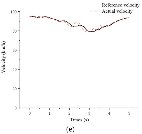 Emulation outcomes of high attachment conditions. (a) Chart of reference lateral displacement and actual lateral displacement; (b) Lateral error diagram; (c) Comparison of the reference yaw and the actual yaw; (d) Yaw error diagram; (e) Reference velocity and actual velocity comparison chart.