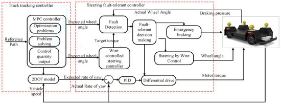 In this area, numerous investigations have been carried out in various countries, including pure pursuit [1,2], Stanley [3], sliding mode [4,5], adaptive [6,7], model predictive [8,9], nonlinear model predictive control [10], potential field control [11,12,13], and feed-forward pre-scanning control [14]. Matthew Brown et al. conceived of a comprehensive control architecture for path planning and tracking control by MPC theory to enhance the security and trajectory following precision of the autonomous car [15]. Bobier applied a sliding mode variable construction control technique to provide fast and stable trajectory tracking by estimating the lateral oscillation angular velocity. [16]. Matteo Corno et al. introduced an LPV technique for automatic route-following in the face of steering drive nonlinearity, which successfully reduced tracking errors [17]. Y. H. Li et al. designed adaptive time-domain parameter algorithms for trajectory tracking controllers, and simulation experiments showed that they improved the maneuvering stability, trajectory tracking accuracy and safety performance of self-driving vehicles [18]. An EMPC with a flexible artificial potential field was created by Hongjiu Yang et al. which implemented the automatic electric vehicle to avoid obstacles and trajectory tracking, and experimental results indicated that the designed controller enhanced the effectiveness of obstacle avoidance and track following and ensured the system reliability [19]. Xinxin Liu et al. investigated the trajectory of an independent four-wheel drive steering system’s tracking control machine at high speeds and proposed a feedforward, feedback and a dynamic constraint-based MPC algorithm to improve high-speed trajectory tracking performance [20]. Xin Fan et al. conducted a study on track following control for a driverless-type wheeled tractor using an upgraded quantum genetic LQR method. The results of the simulation demonstrated that the tractor has excellent tracking precision as well as stability [21]. Can Yang et al. employed MPC and fuzzy PID-based controllers for intelligent driving vehicle trajectory-tracking control, and the simulated results suggest that the controller has outstanding behavior [22]. Linhe Ge et al. coupled vertical and horizontal control of the driverless car using an offset-free MPC algorithm to realize improved trajectory-following precision and high-speed reliability [23]. Zhiwei He et al. proposed a two-level controller for horizontal trail-following control for self-driving cars, using an upper level continuous that changed over time, an MPC controller and a function with a radial basis proportional-integral derivation neural network controller in the lower level. The calculation showed that the designed controller can ensure car reliability and good trajectory-following accuracy [24]. Teng Li et al. presented a track tracking control algorithm for the smart electric automobile according to the adaptive optimal control of weight coefficients, which effectively reduced tracking errors through experimental verification [25]. A double neural internetwork active fault control strategy based on the feedforward offset technique of neural network estimation was proposed by Jian Hu et al. Both emulation and experimentation leads prove that the control strategy has good capability [26]. Jian Ou et al. proposed a longitudinal and lateral force co-reconfiguration fault-tolerant controllers policy according to active turn control, which was shown to significantly improve vehicle reliability of driving and security in the event of an actuator failure [27]. Based on deep reinforcement learning theory, Huifan Deng suggested a fault-tolerant control system for four-wheel drive electric cars. Vehicle stability, driver comfort and power consumption were effectively improved [28]. Ding, Z. et al. designed an improved dynamic Kalman filter and proposed a model predictive control method considering the anti-tilt constraint. The analogue findings indicate the approach’s utility [29]. Wang T proposed a hierarchical plan and follow-up frame for self-driving cars. The simulation results show the ability to solve most common scenarios on structured roads with reasonable decision and control capabilities [30].