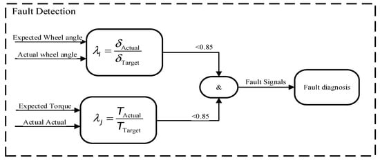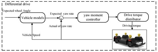 When the failure of a single steering motor occurs during trajectory tracking of an unmanned fully line-controlled distributed drive electric vehicle, the vehicle is controlled in a fault-tolerant manner by using differential drive. The main working principle of differential drive is shown in Figure 14.