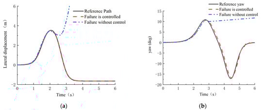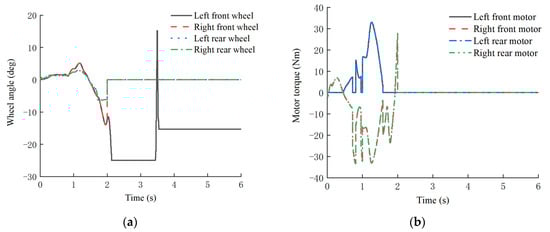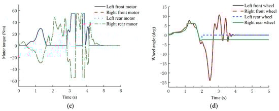 As can be seen in Figure 17, a left rear motor failure occurs during the vehicle’s track tracking process, at which point the vehicle requires a differential drive operation command. Before 2 s, the vehicle can accurately trail the double lane path. It is obvious that the vehicle lacks fault-tolerant control at this point since the left steering motor has a failed turn angle value of 0 degrees at 2 s. Since the motor failure will cause the vehicle to understeer, the vehicle will find it difficult to follow the course and flee. However, a vehicle with fault-tolerant regulation is able to accurately continue to track the path. The proposed fault-tolerant control regulation for steering by wire can improve the safety and stabilization of the vehicle when a single motor fails.