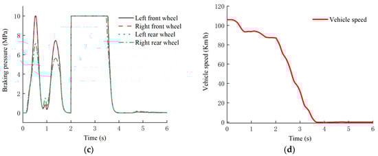 From Figure 18, it can be seen that in 2 s when there is vehicle right front, right rear, left rear wire-controlled steering motor failure, at this moment in time the vehicle, according to the fault-tolerant decision-making instructions for emergency braking, quickly reaches the maximum 10 MPa in the four wheels of the wheel cylinder pressure, as shown in Figure 18c; in Figure 18d, the vehicle speed in the implementation of emergency braking can be seen. The vehicle speed slows down quickly in 2 s from 85 km/h down to 0 km/h, so that the vehicle stops in the shortest possible time to ensure the security of the vehicle.