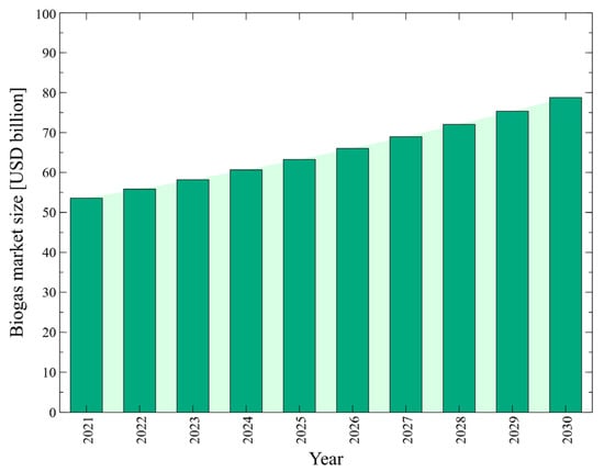 Nowadays, special research focus is being placed on the concept of the environmental protection and sustainability development. In this context, the increasing interest in biogas is related to the fact that it is an alternative to fossil fuels. In particular, biogas technology may contribute to reducing both the waste generation and emission of greenhouse gases. Therefore, in recent years, a continuous increase in biogas production has been noted all over the world. Moreover, since in the energy sector of many countries biogas production is a significant option, it is envisioned that its worldwide market size will increase from USD 55.84 billion in 2022 to USD 78.8 billion by 2030 [1] (Figure 1).