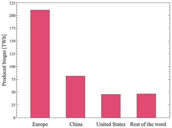Biogas primarily consists of methane (CH4, 50–75% by volume), carbon dioxide (CO2, 25–50% by volume), and minor amounts of other gases, such as nitrogen (N2), oxygen (O2), hydrogen (H2), hydrogen sulfide (H2S) as well as water vapor (H2O)(g) [2,3,4]. It is a green energy carrier characterized by a calorific value between 20 and 32 MJ/m3 [5] depending on the CH4 content. However, it is important to note that to find various applications, the methane concentration in biogas should exceed 90% [4]. After upgrading and cleaning with the use of commercially available technologies [6,7,8,9], biogas may be used for power and heat generation, transportation, as well as thermal energy generation for industrial applications. Moreover, methane-rich biogas can be used as a feedstock in material and chemical production [10]. The final biogas applications depend not only on its composition but also on the factors such as the upgrading process and national frameworks [11]. Worthy of note, the largest share of biogas is produced in Europe [12] (Figure 2), where it is mainly used for the generation of heat and electricity [6,13]. The biogas perspectives in Europe were thoroughly discussed in the review paper [14].