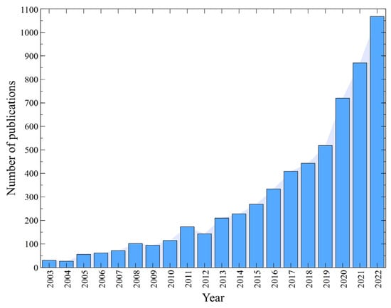 The application of AnMBR technology for biogas production is frequently investigated in scientific research. Indeed, ScienceDirect contains 5946 records related to the presented subject which have been published between 2003 and 2022. Moreover, the performed analysis demonstrated that the number of articles focused on biogas and AnMBRs increased significantly, especially in the last decade (Figure 3). Undoubtedly, this finding confirms the importance of the research topic presented in the current study.