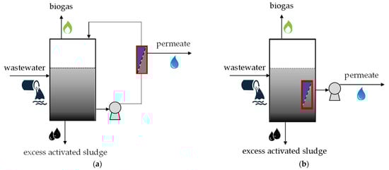 Schematic diagrams of the AnMBR configurations used for biogas production: (a) external; and (b) submerged.