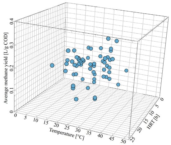 As demonstrated above, defining the impact of HRT on the biogas production in AnMBRs applied for municipal and domestic wastewater is not straightforward. Therefore, in the current study, we performed an analysis data collected from the literature [70,71,72,73,74,75,77,78,83,84,85,87,89,90,92,95,96] (Figure 5). It can be seen that, generally, the highest methane yield values have been obtained for the shortest HRT. However, the most suitable value of HRT in AnMBRs technology applied for biogas production depends on other operational factors, including temperature. Based on the literature review and findings presented above, it can be concluded that further experimental studies on the impact of HRT on the biogas yield in AnMBRs are highly warranted.