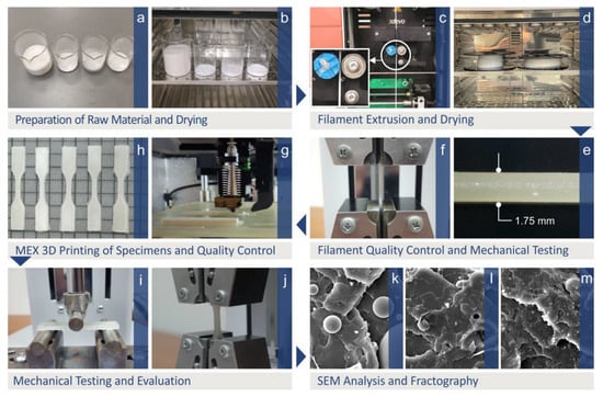 The specific steps taken in the experimental approach and its process flow illustrated in screenshots (a) raw materials, (b) drying process, (c) filament extrusion, (d) filament drying, (e) filament quality control, (f) filament tensile testing, (g) samples 3D printing, (h) 3D printed samples, (i) three-point bending test, (j) tensile test, (k–m) SEM analysis on the fracture surface at various magnifications.