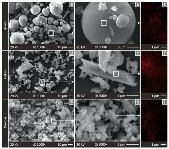 Investigation of Glass Fillers: (a) SEM image of Glass Beads at 1000× magnification, (b) SEM image of Glass Beads at 5000× magnification on the region indicated in (a), (c) EDS mapping for the Glass Beads filler on the region indicated in (b), (d) SEM image of Glass Flakes at 1000× magnification, (e) SEM image of Glass Flakes at 5000× magnification on the region indicated in (d), (f) EDS mapping for the Glass Flakes filler on the region indicated in (e), (g) SEM image of Glass Powder at 1000× magnification, (h) SEM image of Glass Powder at 5000× magnification on the region indicated in (g), (i) EDS mapping for the Glass Powder filler on the region indicated in (h).