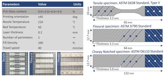 The filaments produced by the two extrusion steps included the pure PLA polymer, which was utilized as a reference material to evaluate the mechanical properties of the composites, as well as PLA/glass beads, PLA/glass flakes, and PLA/glass powder composites. The filaments produced were used to fabricate specimens on the Intamsys Funmat HT 3D printer (Shanghai, China). Prior to 3D printing, the 3D printer settings were determined through trials using the Intamsuite software platform (Intamsys, Shanghai, China). For each experiment, the specimens were created following the dimensional specifications listed in the respective ASTM standards. Figure 3 provides a summary of the 3D printing parameters used in the study, the geometry, the 3D printing structure, and the corresponding standard used in each mechanical test.