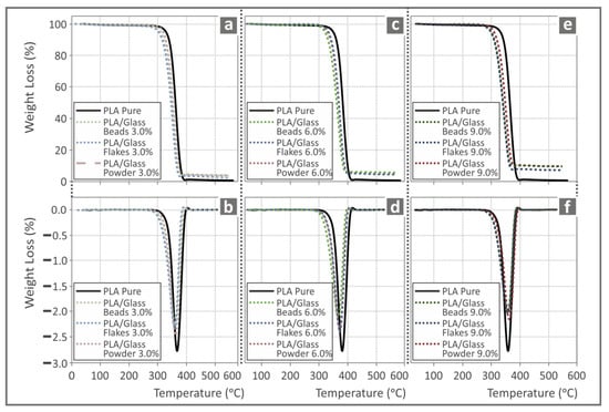 Thermal Decomposition of pure PLA and PLA/Glass Fillers Compounds: (a) TGA curves for pure PLA, PLA/Glass Beads 3.0 wt.%, PLA/Glass Flakes 3.0 wt.%, PLA/Glass Powder 3.0 wt.%, (b) DTGA curves for pure PLA, PLA/Glass Beads 3.0 wt.%, PLA/Glass Flakes 3.0 wt.%, PLA/Glass Powder 3.0 wt.%, (c) TGA curves for pure PLA, PLA/Glass Beads 6.0 wt.%, PLA/Glass Flakes 6.0 wt.%, PLA/Glass Powder 6.0 wt.%, (d) DTGA curves for pure PLA, PLA/Glass Beads 6.0 wt.%, PLA/Glass Flakes 6.0 wt.%, PLA/Glass Powder 6.0 wt.%, (e) TGA curves for pure PLA, PLA/Glass Beads 9.0 wt.%, PLA/Glass Flakes 9.0 wt.%, PLA/Glass Powder 9.0 wt.%, (f) DTGA curves for pure PLA, PLA/Glass Beads 9.0 wt.%, PLA/Glass Flakes 9.0 wt.%, PLA/Glass Powder 9.0 wt.%.