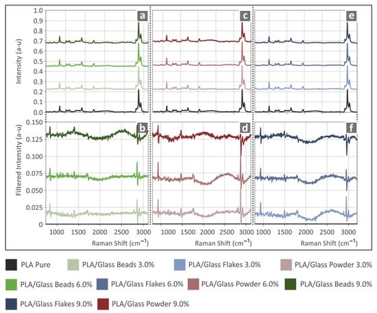 Raman spectra from (a) pure PLA, PLA/Glass Beads 3 wt.%, 6 wt.%, 9 wt.%; (b) the differences of PLA/Glass Beads from pure PLA; (c) pure PLA, PLA/Glass Flakes 3 wt.%, 6 wt.%, 9 wt.%; (d) the differences of PLA/Glass Flakes from pure PLA; (e) pure PLA, PLA/Glass Powder 3 wt.%, 6 wt.%, 9 wt.%, (f) the differences of PLA/Glass Powder from pure PLA.