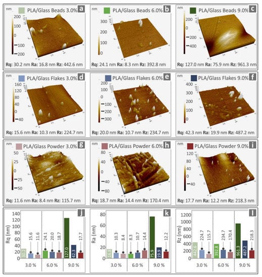 Analysis of filament side surfaces using AFM: (a) PLA/Glass Beads 3.0 wt.%, (b) PLA/Glass Beads 6.0 wt.%, (c) PLA/Glass Beads 9.0 wt.%, (d) PLA/Glass Flakes 3.0 wt.%, (e) PLA/Glass Flakes 6.0 wt.%, (f) PLA/Glass Flakes 9.0 wt.%, (g) PLA/Glass Powder 3.0 wt.%, (h) PLA/Glass Powder 6.0 wt.%, (i) PLA/Glass Powder 9.0 wt.%, and graphs representing the correlation between the glass beads, flakes, and powder content and the surface roughness parameters in the compounds are shown: (j) Rq, (k) Ra, (l) Rz.