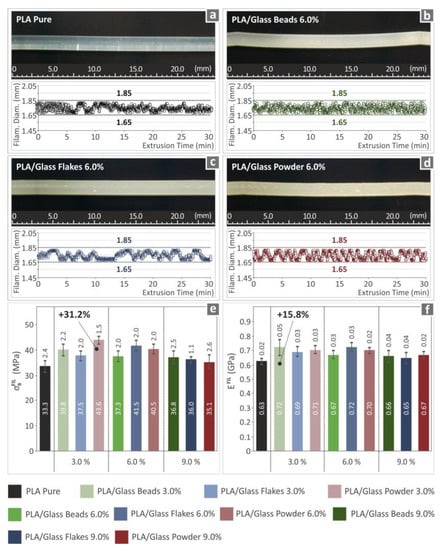Visual inspection and diameter measurements of extruded filament segments: (a) Pure PLA filament, (b) PLA/Glass Beads 6.0 wt.% filament, (c) PLA/Glass Flakes 6.0 wt.% filament, (d) PLA/Glass Powder 6.0 wt.% filament, and (e) tensile test results, (f) modulus of elasticity results for fabricated filaments.