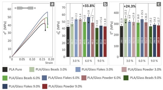 The 3D printing process followed after the filaments were assessed, in order to manufacture specimens and examine their mechanical behavior. The tensile test results are displayed in Figure 8. All of the specimens prepared, at all concentrations of the three distinct glass additive types, showed an improvement in tensile strength, according to Figure 8b. The PLA/Glass Beads specimens at a concentration of 9.0 wt.% showed a slight decrease compared to the other composites; still, their properties were marginally higher than the pure PLA polymer. The PLA/Glass Flakes composite with 6.0 wt.% concentration revealed the highest value of 56.7 MPa out of all the samples tested, which was 33.8% higher than the sample composed of PLA. Figure 8c shows a similar pattern for the modulus of elasticity, with all samples exhibiting an increase in value aside from the PLA/Glass Beads specimen with a concentration of 9.0 wt.%, which once more exhibited a minor decline. The sample with the highest elasticity modulus, which was 24.3% higher than that of pure PLA and contained glass beads, was that with a concentration of 3.0 weight percent.