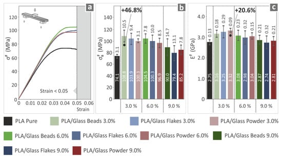 Figure 9 shows the values of the flexural properties as they were derived in the corresponding tests. According to the ASTM D790-10 standard, the average flexural strength values were calculated at a maximum strain of 5% since no failure occurred at the specimens up to this stain. The reinforcement of the flexural characteristics was significantly improved by the addition of glass particles to the PLA matrix, with all composites exhibiting higher values than those of the pure polymer. The maximum flexural strength value found at the PLA/Glass Beads composite at 3.0 wt.%, which was 108.8 MPa, i.e., 46.8% greater than the value for pure PLA (Figure 9b). The flexural modulus of elasticity followed a similar trend, with all composites containing glass additives showing enhanced mechanical responsiveness relative to the virgin polymeric matrix. In this instance, the PLA/Glass Powder combination with a 3.0 wt.% concentration achieved 3.32 GPa, reaching a 20.6% increase over that of pure PLA. The composite with 9.0 wt.% of glass flakes showed a minor decrease (Figure 9c).