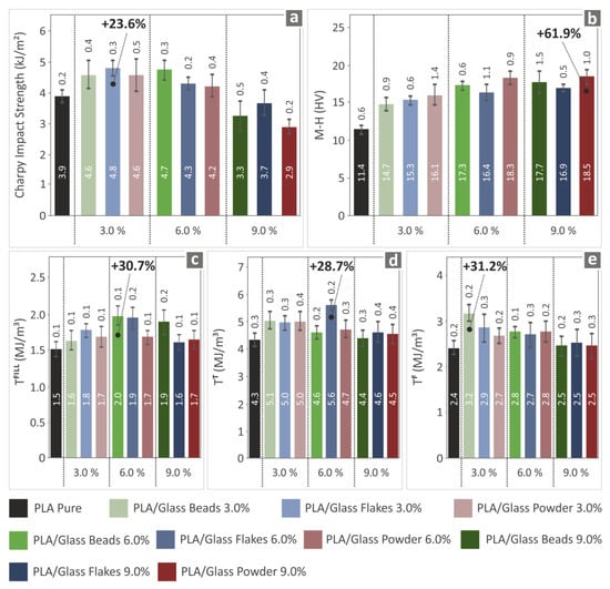 An overview of the mechanical tests performed on the compounds under investigation and the pure PLA polymer is shown in Figure 14. The characteristics regarding the mechanical properties of the material were consistently improved by the addition of various glass particles. The improvement in the mechanical performance caused by the addition of glass particles in different forms (beads, flakes, and powder) may also be influenced by the interactions occurring at the interface between the particles and the matrix [72].