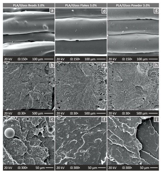SEM pictures for (a) side surface of PLA/Glass Beads 3.0 wt.% specimen at 150× magnification, (b) fracture surface of PLA/Glass Beads 3.0 wt.% specimen at 30× magnification, (c) fracture surface of PLA/Glass Beads 3.0 wt.% specimen at 300× magnification, (d) side surface of PLA/Glass Flakes 3.0 wt.% specimen at 150× magnification, (e) fracture surface of PLA/Glass Flakes 3.0 wt.% specimen at 30× magnification, (f) fracture surface of PLA/Glass Flakes 3.0 wt.% specimen at 300× magnification, (g) side surface of PLA/Glass Powder 3.0 wt.% specimen at 150× magnification, (h) fracture surface of PLA/Glass Powder 3.0 wt.% specimen at 30× magnification, and (i) fracture surface of PLA/Glass Powder 3.0 wt.% specimen at 300× magnification.