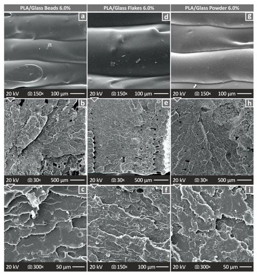 SEM pictures for (a) side surface of PLA/Glass Beads 6.0 wt.% specimen at 150× magnification, (b) fracture surface of PLA/Glass Beads 6.0 wt.% specimen at 30× magnification, (c) fracture surface of PLA/Glass Beads 6.0 wt.% specimen at 300× magnification, (d) side surface of PLA/Glass Flakes 6.0 wt.% specimen at 150× magnification, (e) fracture surface of PLA/Glass Flakes 6.0 wt.% specimen at 30× magnification, (f) fracture surface of PLA/Glass Flakes 6.0 wt.% specimen at 150× magnification, (g) side surface of PLA/Glass Powder 6.0 wt.% specimen at 150× magnification, (h) fracture surface of PLA/Glass Powder 6.0 wt.% specimen at 30× magnification, and (i) fracture surface of PLA/Glass Powder 6.0 wt.% specimen at 150× magnification.