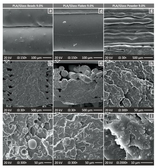 SEM pictures for (a) side surface of PLA/Glass Beads 9.0 wt.% specimen at 150× magnification, (b) fracture surface of PLA/Glass Beads 9.0 wt.% specimen at 30× magnification, (c) fracture surface of PLA/Glass Beads 9.0 wt.% specimen at 300× magnification, (d) side surface of PLA/Glass Flakes 9.0 wt.% specimen at 150× magnification, (e) fracture surface of PLA/Glass Flakes 9.0 wt.% specimen at 30× magnification, (f) fracture surface of PLA/Glass Flakes 9.0 wt.% specimen at 300× magnification, (g) side surface of PLA/Glass Powder 9.0 wt.% specimen at 30× magnification, (h) fracture surface of PLA/Glass Powder 9.0 wt.% specimen at 300× magnification, and (i) fracture surface of PLA/Glass Powder 9.0 wt.% specimen at 2000× magnification.